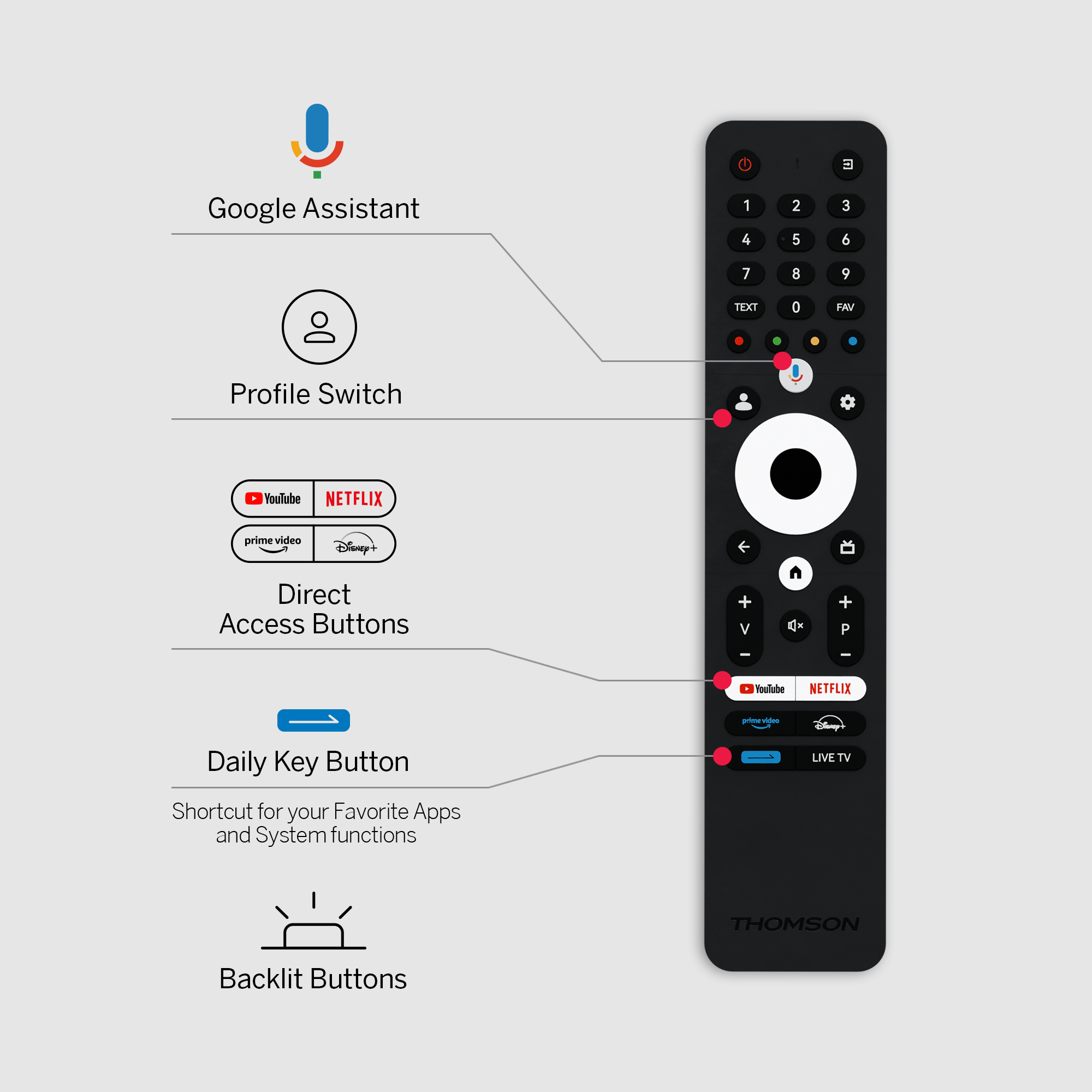Thanks to Far-Field technology, controlling your TV has never been easier. You can use voice commands from across the room without using the remote, allowing you to adjust settings, search for content, or control your smart home devices hands-free. Alternatively, you can use the Google Assistant button on your ergonomic remote control to intuitively navigate your TV. On top of that, the remote control offers smooth backlighting, which allows you to keep an eye on everything, even in dim lighting.