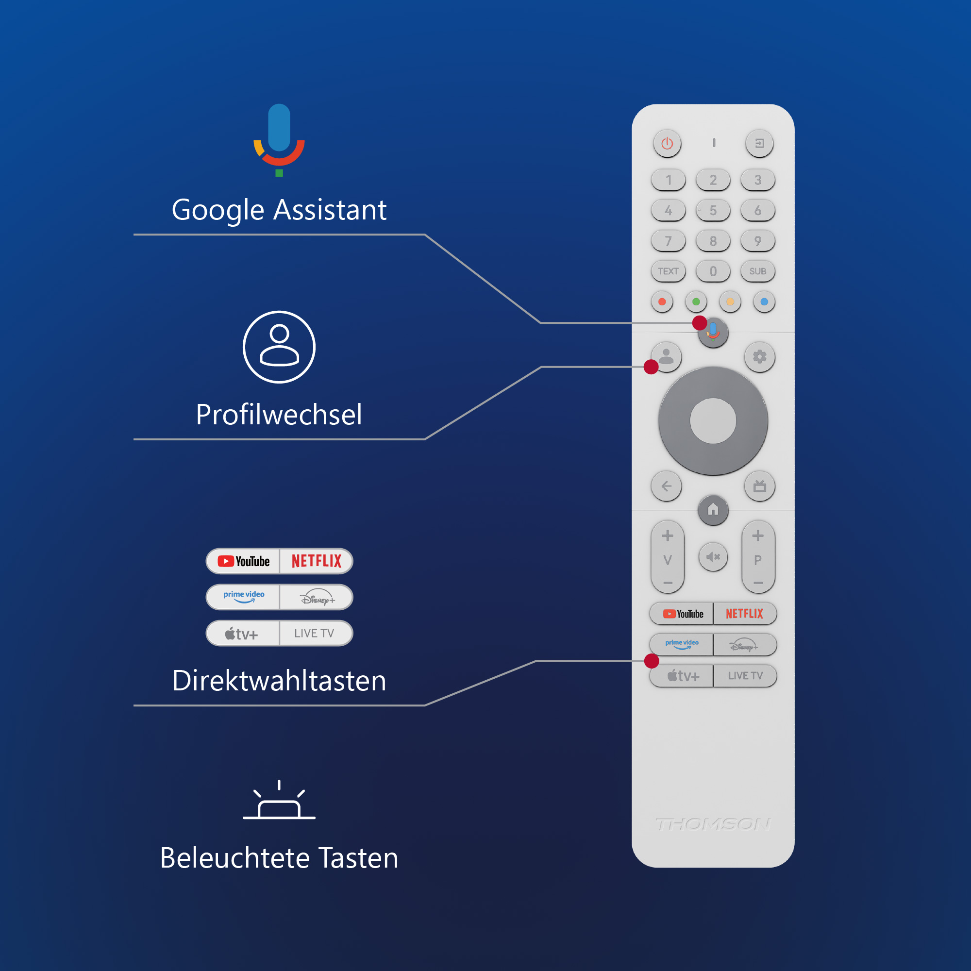 Die ergonomische Fernbedienung mit sanfter Hintergrundbeleuchtung erlaubt es Ihnen, auch bei schwachem Licht alles im Blick zu behalten. Und der integrierte Google Assistant ermöglicht eine intuitive TV-Steuerung per Sprachbefehl. Suchen Sie nach Ihren Lieblingsfilmen, fragen Sie nach Empfehlungen, die zu Ihrer Stimmung passen oder steuern Sie kompatible Smart-Geräte – ganz bequem per Sprachbefehl.