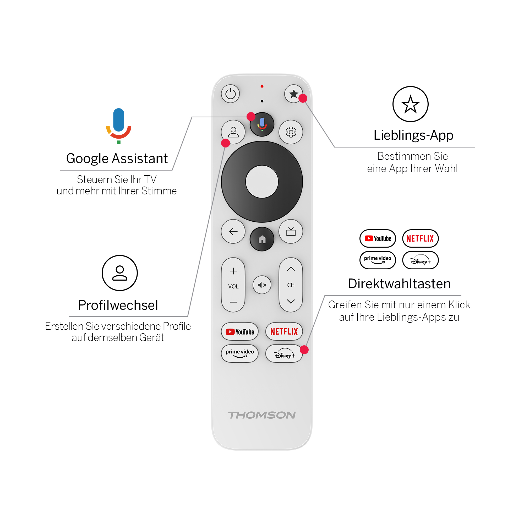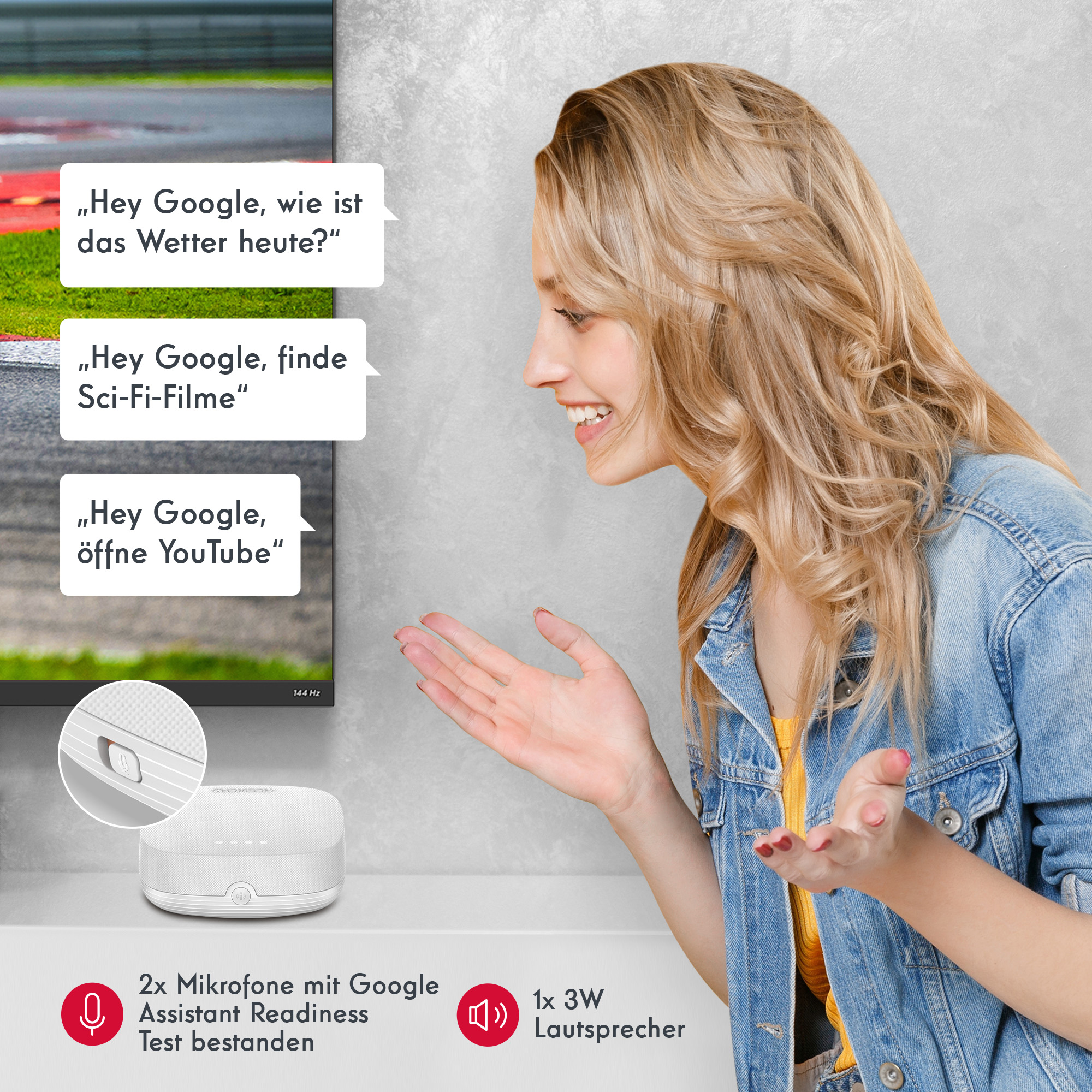 Die THOMSON Streaming Box Plus bietet zudem durchdachte Upgrades wie einen Far-Field-Sprachassistenten und die "Find My Remote"-Funktion. Sprechen Sie von überall im Raum mit Ihrem Gerät und steuern Sie Ihren Fernseher freihändig. Die integrierten Mikrofone, zertifiziert für den Google Assistant, sorgen für eine bequeme Sprachsteuerung. Sie verfügt sogar über einen eingebauten Lautsprecher, der auf Ihre Fragen und Anforderungen antwortet.