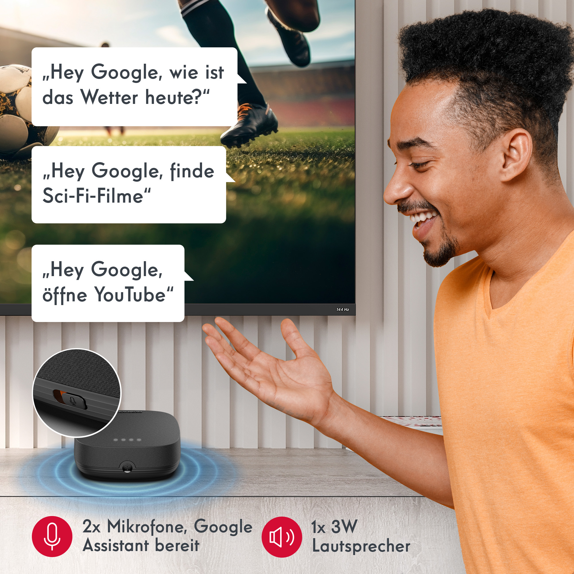 Die THOMSON Streaming Box Plus bietet zudem durchdachte Upgrades wie einen Far-Field-Sprachassistenten und die "Find My Remote"-Funktion. Sprechen Sie von überall im Raum mit Ihrem Gerät und steuern Sie Ihren Fernseher freihändig. Die integrierten Mikrofone, zertifiziert für den Google Assistant, sorgen für eine bequeme Sprachsteuerung. Sie verfügt sogar über einen eingebauten Lautsprecher, der auf Ihre Fragen und Anforderungen antwortet.