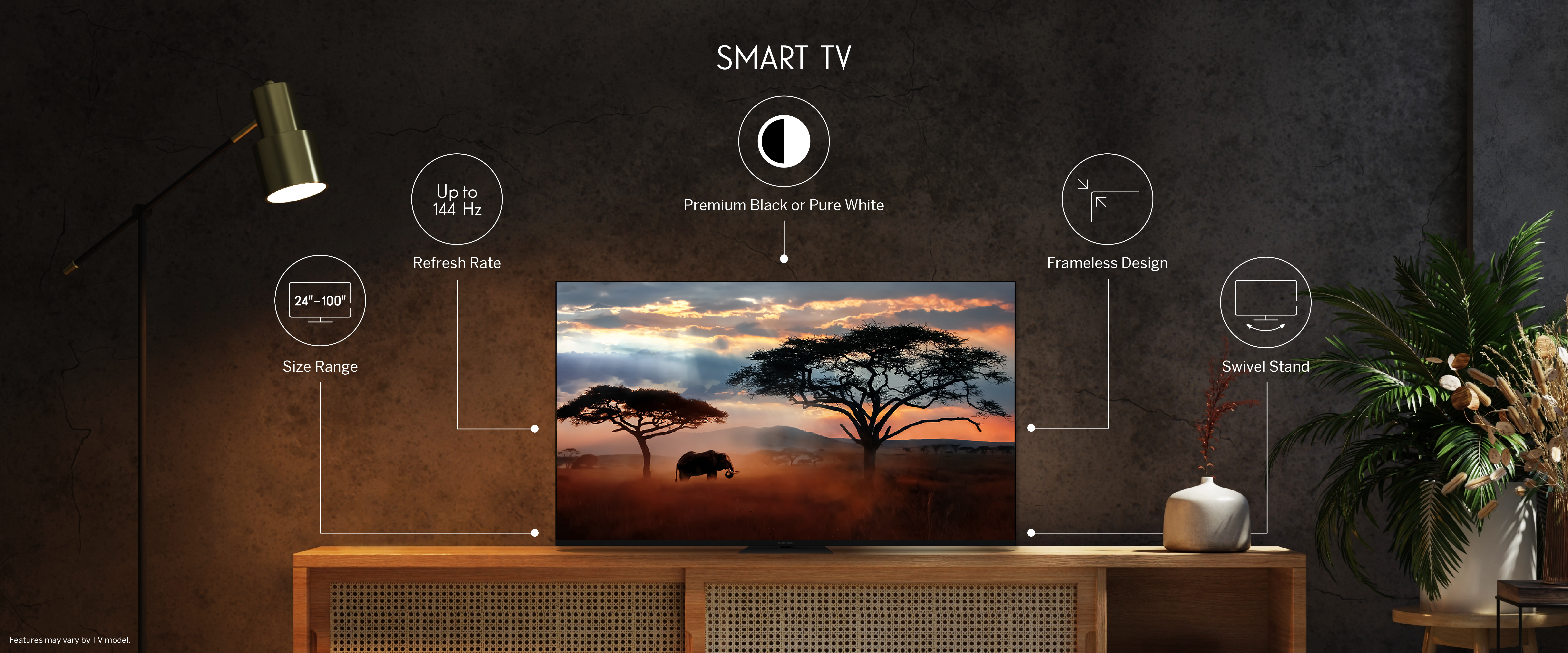 Experience fluent images and high responsiveness in rich 4K UHD quality with the Thomson Google TV 65" QLED Pro.A 144 Hz refresh rate ensures smooth and responsive visuals, ideal for fast-paced content like action movies, sports and gaming. This feature reduces motion blur and display lag, delivering the most comfortable viewing and gaming experience.Powered by Quantum Dot nanocrystals, a QLED display delivers balanced brightness, striking contrasts, and an expanded color range. Combined with 4K Ultra HD resolution you can capture every detail and immerse yourself in crystal clear images. Dolby Vision technology enhances the brightness in each scene, ensuring precise color reproduction for lifelike images. Enjoy dynamic audio with Dolby Atmos for an immersive TV experience. Google TV simplifies your entertainment by organizing content from your apps and subscriptions. Create multiple user profiles and benefit from curated recommendations. Enjoy a wide range of smart features, such as access to 400,000+ movies and TV shows, smart voice control with Google Assistant, and Chromecast built-in to stream content from compatible smart devices to your TV. The ergonomic remote control with smooth backlighting allows you to keep an eye on everything, even in dim lighting. The integrated Google Assistant enables you to intuitively control your TV with voice commands. Search for your favorite movies, ask for recommendations based on your mood, or control compatible smart devices - all with the convenience of your voice.Benefit from increased placement flexibility with the central swivel stand and enhance your viewing experience. The innovative design enables you to effortlessly rotate your TV by up to 30 degrees, allowing you find the perfect angle for your entertainment setup.The built-in triple tuner makes reception via satellite-antenna, terrestrial antenna, or cable possible. Easily receive all available channels without additional hardware.