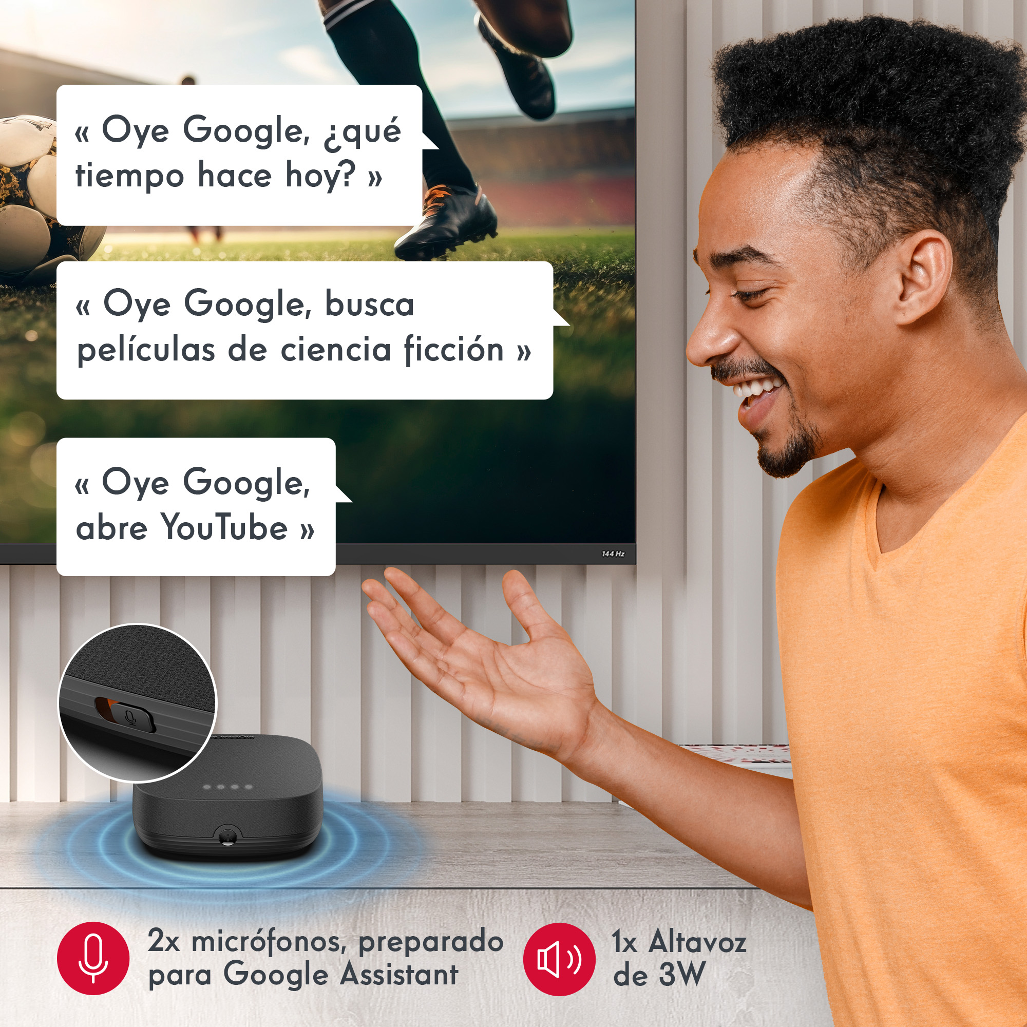 Navega por tu TV con manos libres utilizando tu voz desde cualquier lugar de la habitación. Disfruta de la integración con tu hogar inteligente y la capacidad de reproducir música o buscar películas sin esfuerzo. Equipado con micrófonos avanzados que han pasado la prueba de preparación de Google Assistant, el dispositivo garantiza un reconocimiento preciso de tus comandos. El altavoz integrado lo mantiene siempre listo para responder.