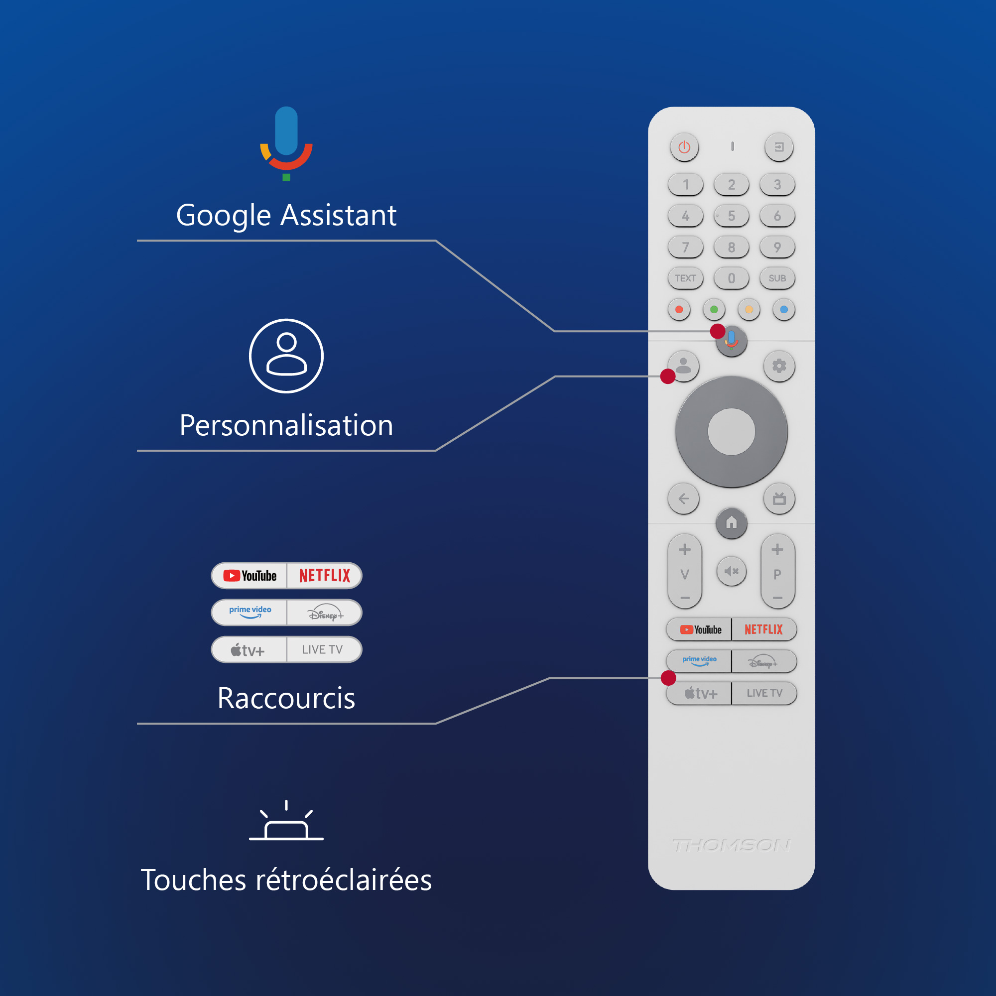 Vous avez perdu ou cassé la télécommande de votre téléviseur? Remplacez-la simplement par la télécommande Bluetooth officielle Thomson Google TV pour les modèles 4K UHD. Il s'agit du même modèle que celui fourni avec votre téléviseur, ce qui garantit une compatibilité totale, et une prise en main très simple.