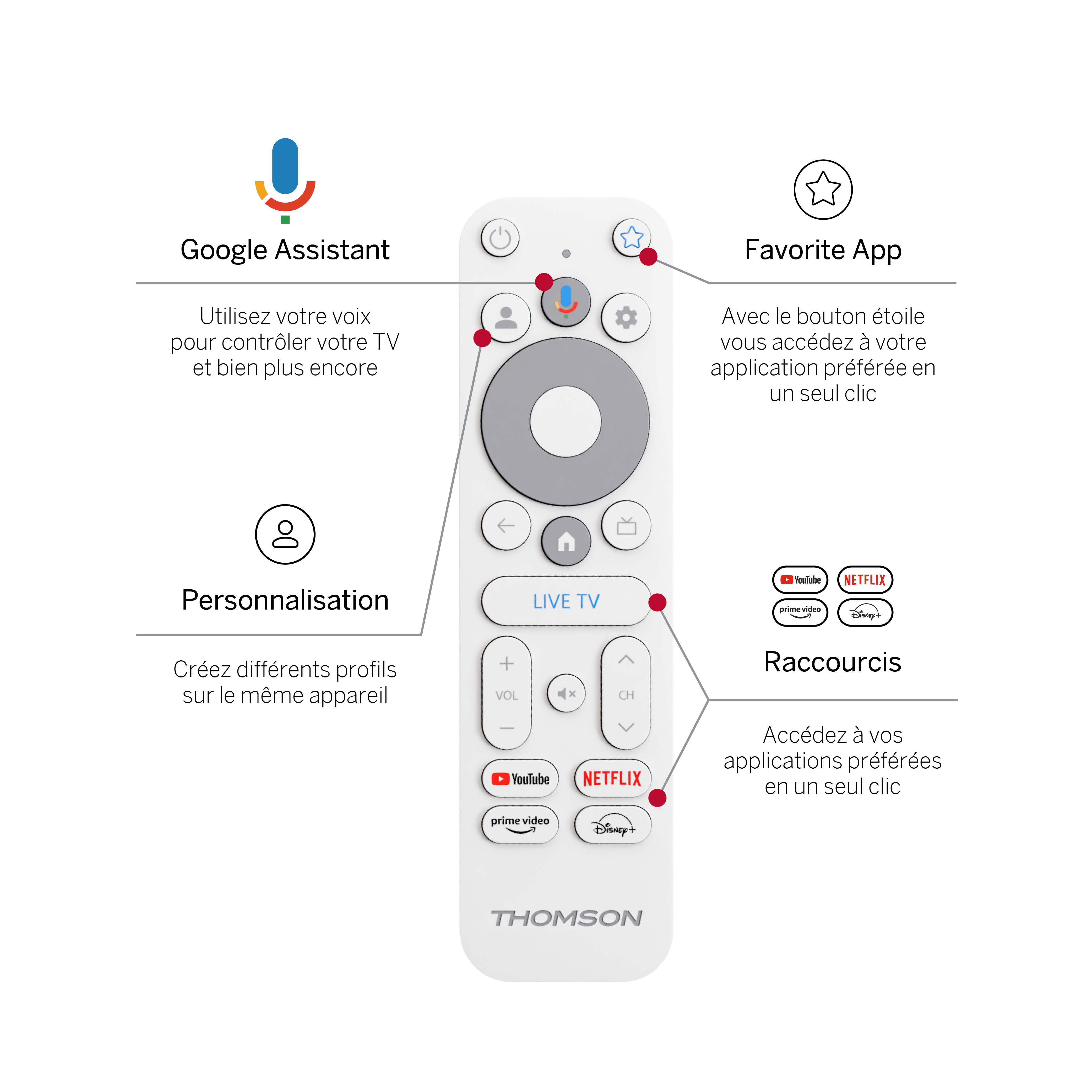 La télécommande incluse est conçue pour offrir confort et rapidité et dispose de l'assistance vocale Google Assistant. Dites simplement ce que vous recherchez, des clips YouTube tendance aux derniers blockbusters, et laissez le Dongle s'occuper du reste. Les boutons d'accès direct vous permettent d'accéder rapidement à vos applications les plus utilisées.