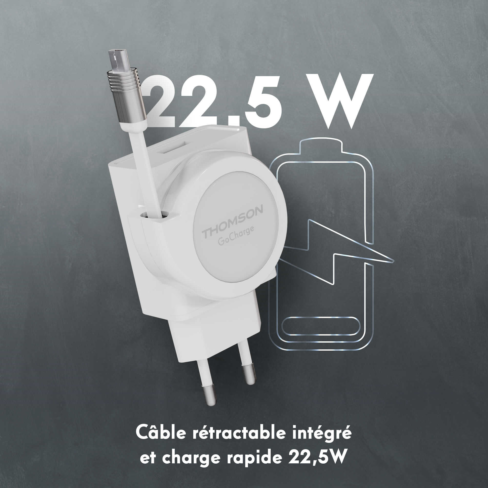 Rapide, flexible et prêt à l'emploi. Restez connecté à domicile, au bureau ou en déplacement grâce au Thomson GoCharge E22AC, compact et efficace. Conçu pour être pratique, il est équipé d'un câble rétractable de 90 cm qui s'ajuste à six longueurs différentes, vous évitant ainsi d'encombrer votre espace avec des câbles emmêlés.