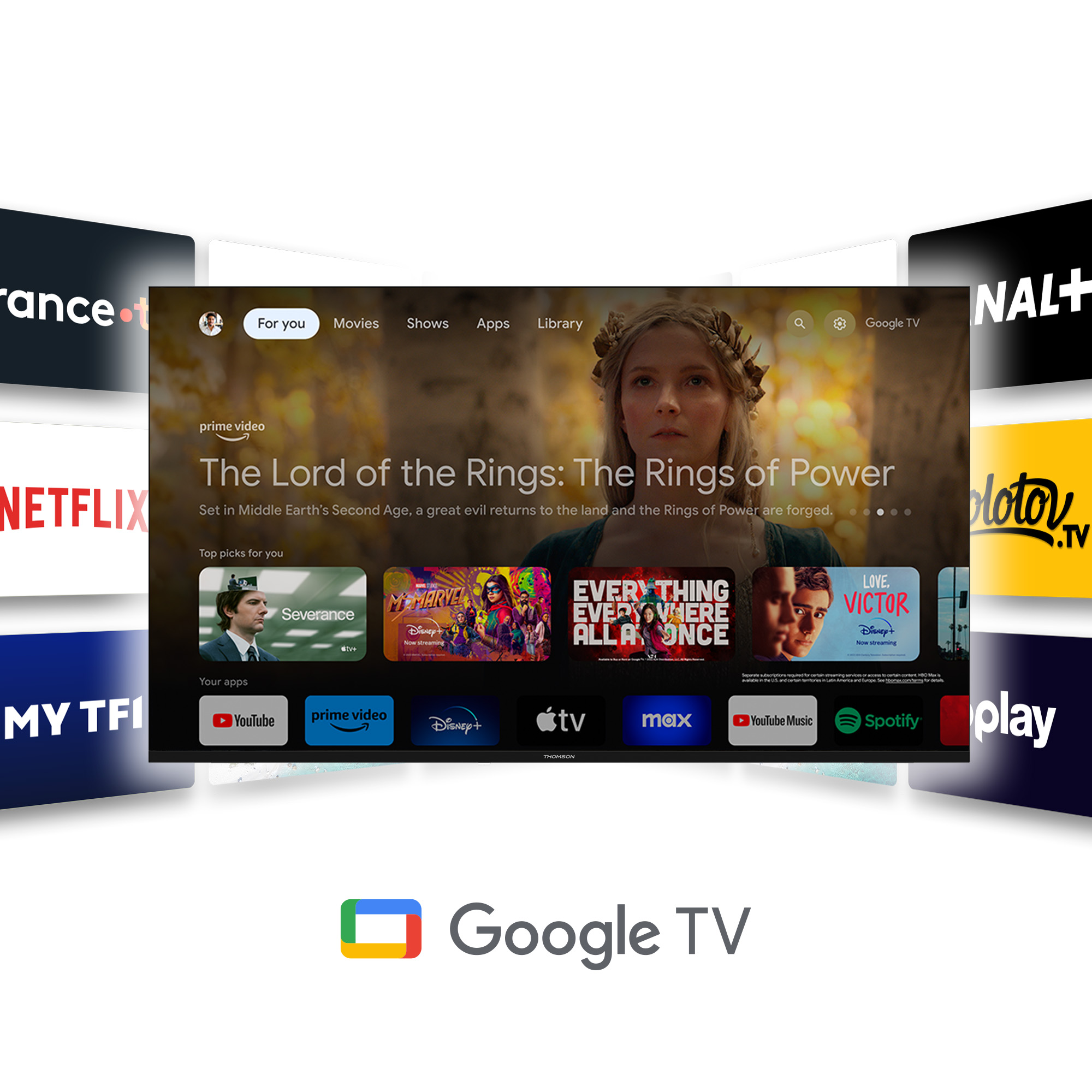Avec la Streaming Box Thomson, vous pouvez transformer en un clin d'œil votre téléviseur en une Smart TV équipée du système d'exploitation Google TV™ (Android™12). Profitez d'un accès à une très large sélection d'applications, y compris des services populaires comme Netflix, Disney+, Prime Video et YouTube. Vos séries préférées, vos documentaires, votre musique, vos événements sportifs et bien plus encore sont désormais à portée de clic. Google TV™ réunit les contenus de différents services de streaming sur l'écran d'accueil, vous n'avez donc pas besoin de passer d'une application à l'autre pour trouver vos films préférés.