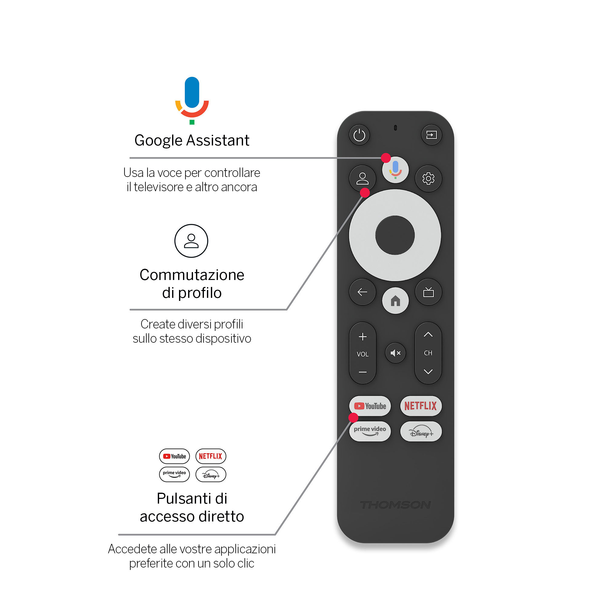La Thomson Streaming Stick 140 offre un'interfaccia facile da usare ed è dotata di un telecomando ergonomico con Google Assistant che rende la navigazione alla ricerca di contenuti un gioco da ragazzi. Utilizzate la voce per trovare i video di YouTube, cercare gli ultimi film usciti o chiedere a Google notizie ed informazioni da tutto il web. Aprite le vostre app preferite con un solo clic sui pulsanti di selezione diretta.