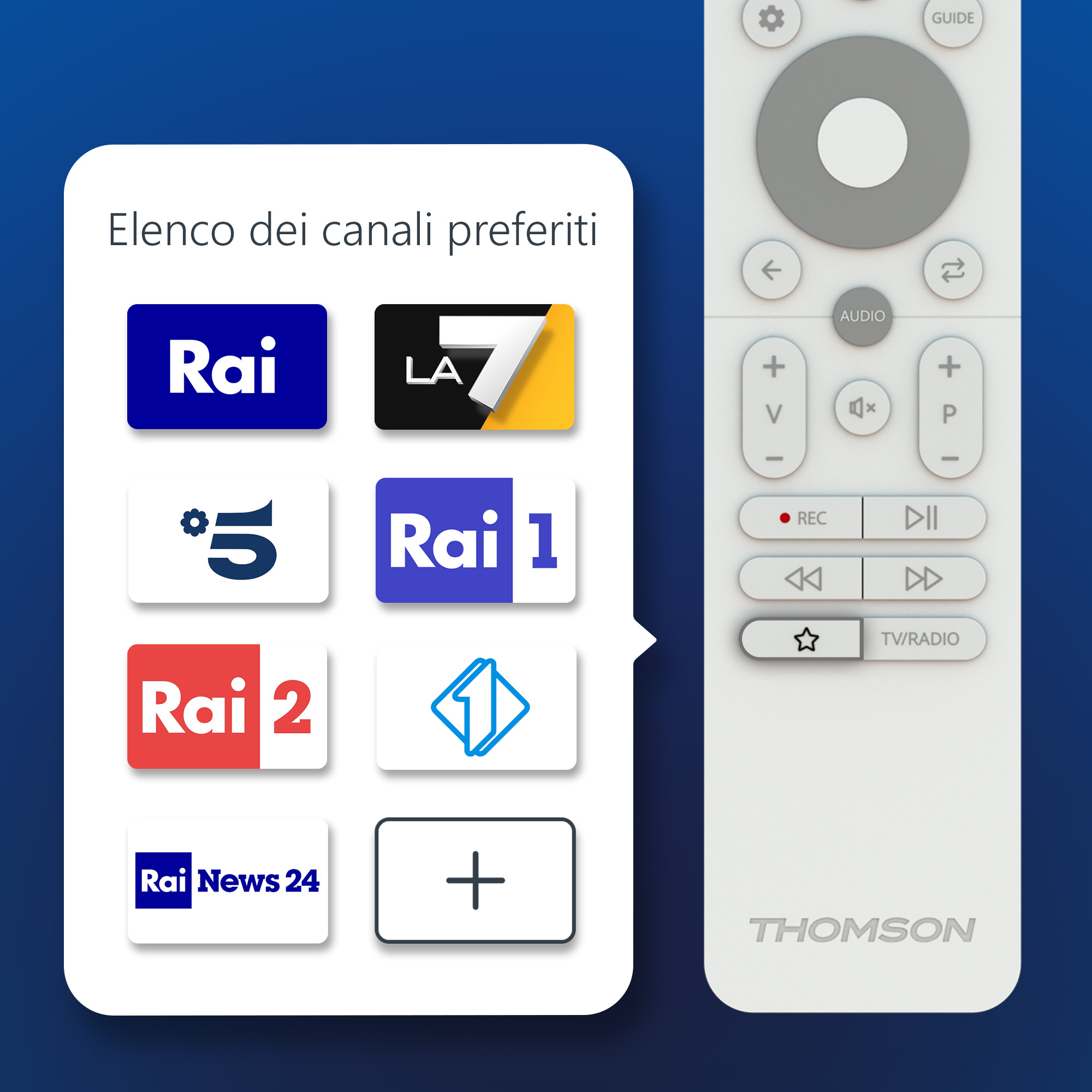 Pulsante preferiti: Con un pulsante puoi accedere rapidamente ai tuoi canali TV preferiti. Inoltre, puoi creare elenchi personali divisi per genere, per gli altri membri della famiglia o in base ad altre preferenze.