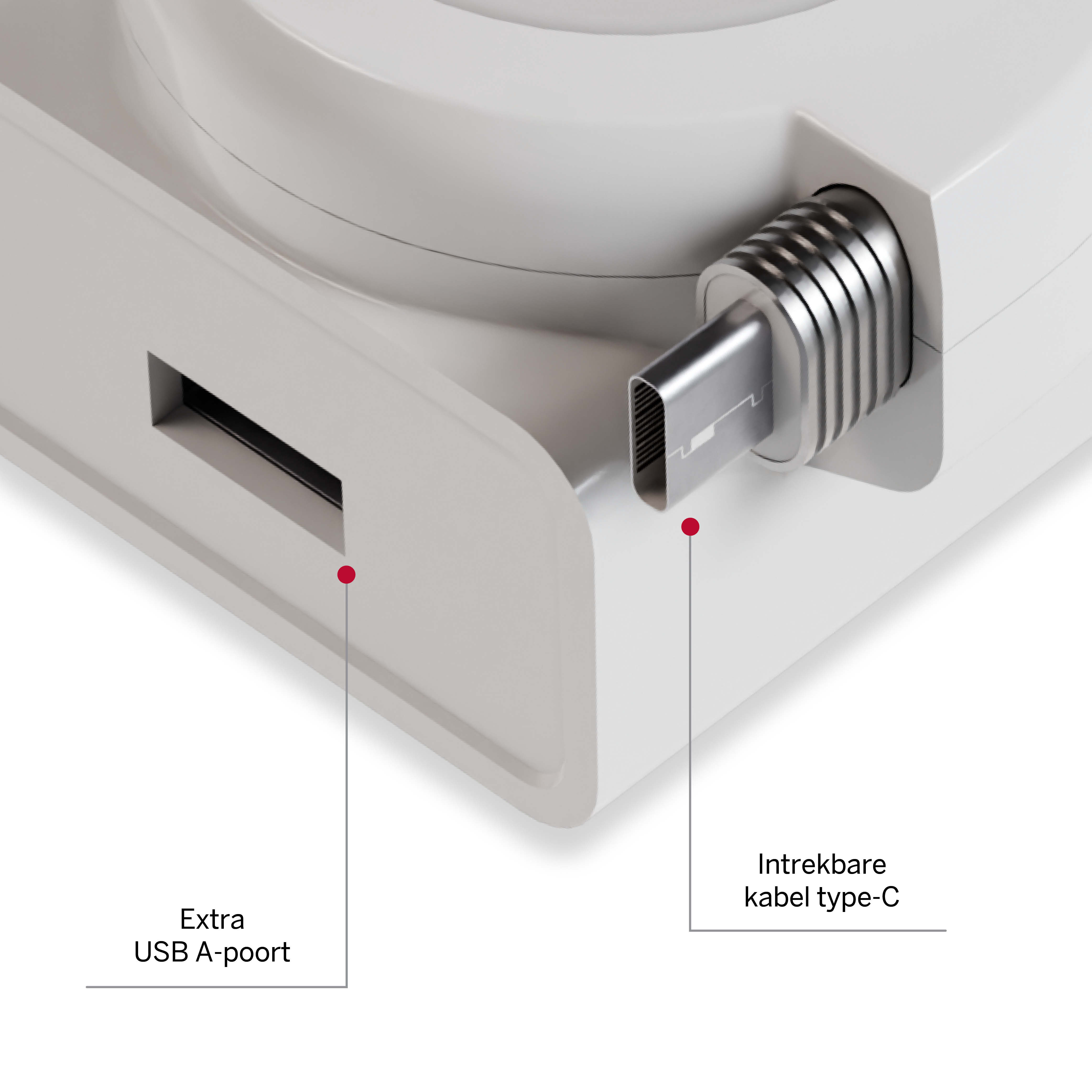 Met een ingebouwde USB-C-kabel en een extra USB-A-poort kunt u twee apparaten tegelijkertijd opladen, ideaal voor uw smartphone en een ander apparaat zoals draadloze oordopjes, een gamecontroller of een tweede telefoon.