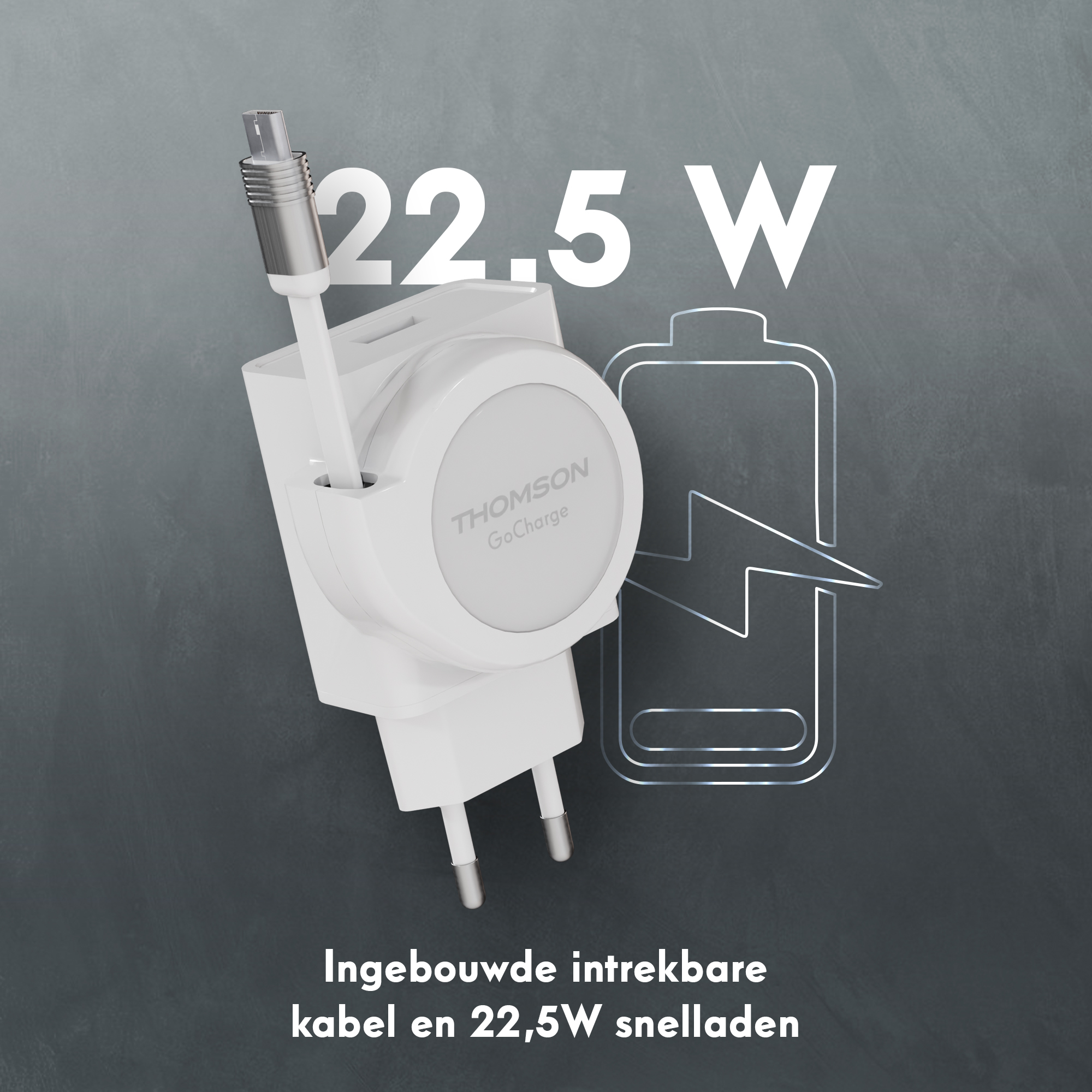 Snel, flexibel en direct klaar voor gebruik. Blijf thuis, op het werk of onderweg van stroom voorzien met de compacte en efficiënte Thomson GoCharge E22AC. Deze is ontworpen met het oog op gebruiksgemak en beschikt over een intrekbare kabel van 90 cm die in zes verschillende lengtes kan worden ingesteld, zodat u geen last heeft van rommelige kabels en uw ruimte netjes blijft.