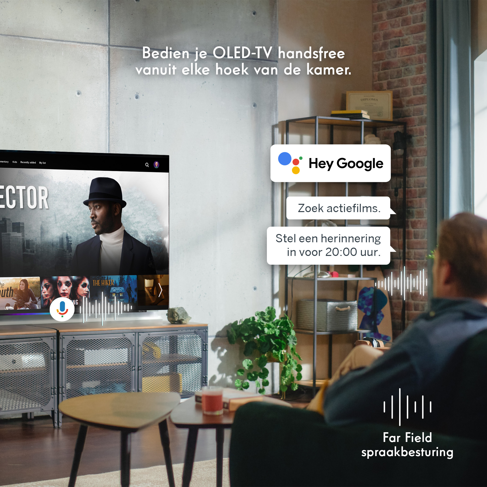 Dankzij Far-Field-technologie is het bedienen van je TV nog nooit zo eenvoudig geweest. Je kunt spraakcommando's gebruiken vanuit elke hoek van de kamer, zonder de afstandsbediening te gebruiken, zodat je instellingen kunt aanpassen, naar content kunt zoeken of je slimme apparaten handsfree kunt bedienen. Als alternatief kun je de Google Assistant-knop op je ergonomische afstandsbediening gebruiken om intuïtief door de TV te navigeren. Bovendien biedt de afstandsbediening zacht achtergrondlicht, waardoor je alles kunt zien, zelfs bij weinig licht.