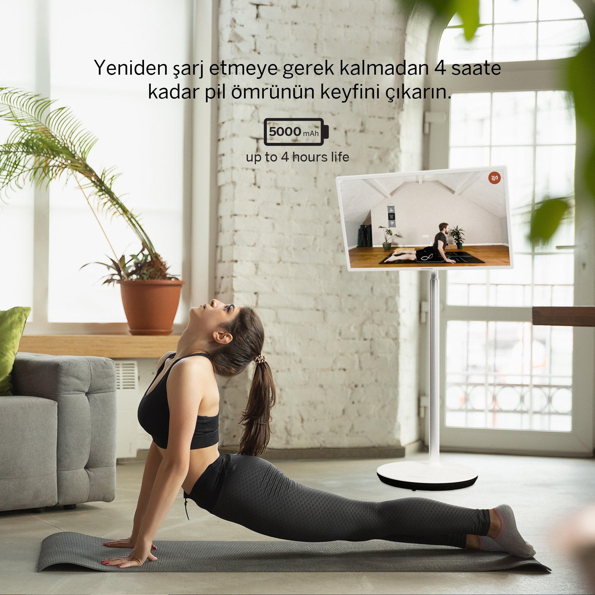 Yerleşik bir pille donatılmış olan bu TV, fişe takmaya gerek kalmadan 4 saate kadar kullanım sunar. Alt kısımdaki tekerlekler hareket etmeyi kolaylaştırır ve ayarlanabilir eğim, yükseklik ve döndürme özellikleri mükemmel izleme açısını elde etmenizi sağlar. Bu, Mobil Smart TV'yi çok yönlü izleme için ideal hale getirir.
