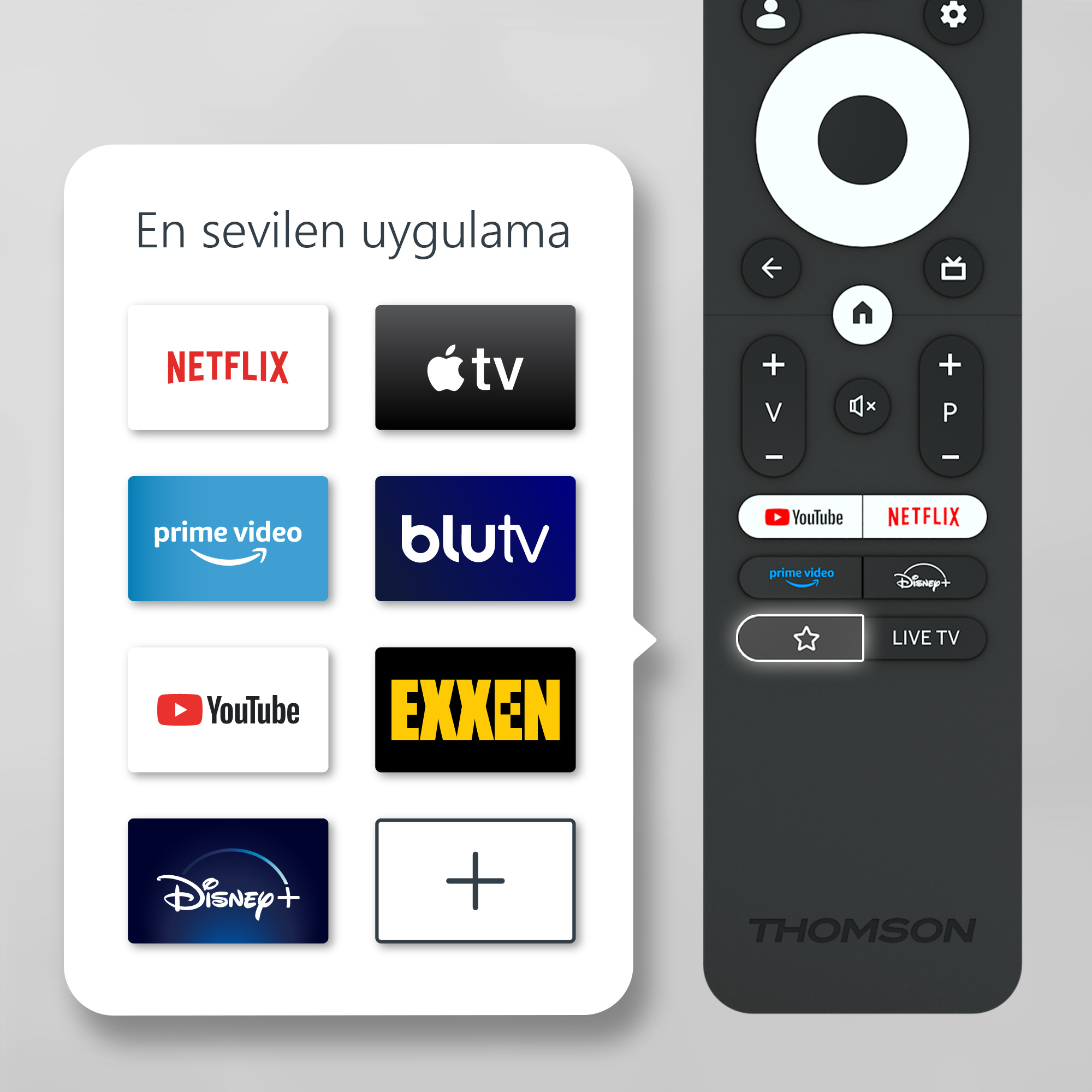 | Direct access buttons on remote control | YouTube, Netflix, Prime Video, Disney+, Favorite App Button, Live TV |