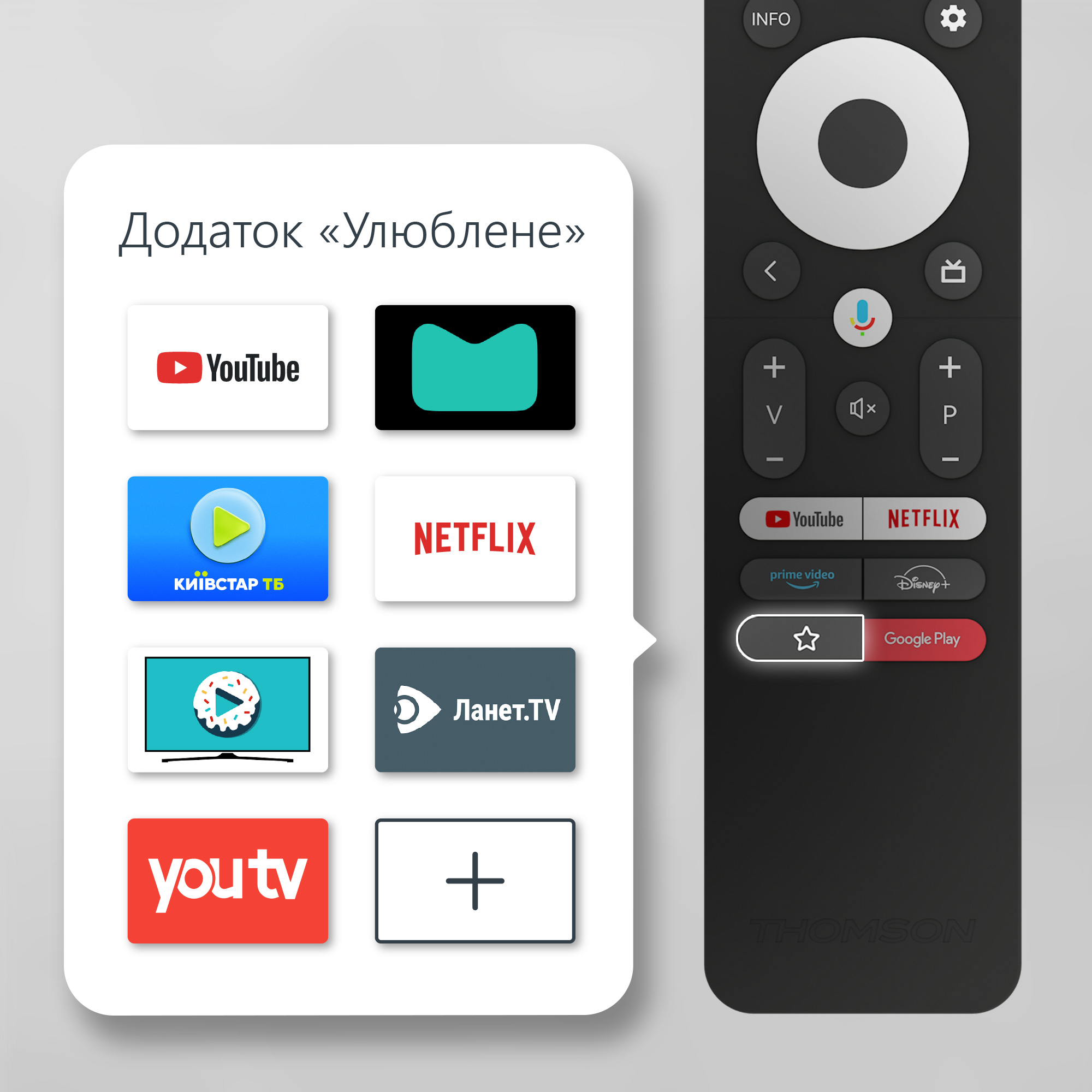 Ергономічний пульт дистанційного керування з плавним підсвічуванням допомагає тримати все під контролем навіть при тьмяному освітленні. З кнопкою FAVORITE ви миттєво отримуєте доступ до улюблених програм, а вбудований Google Assistant дозволяє інтуїтивно керувати телевізором голосовими командами - від пошуку фільмів до отримання рекомендацій та керування сумісними смарт-пристроями.