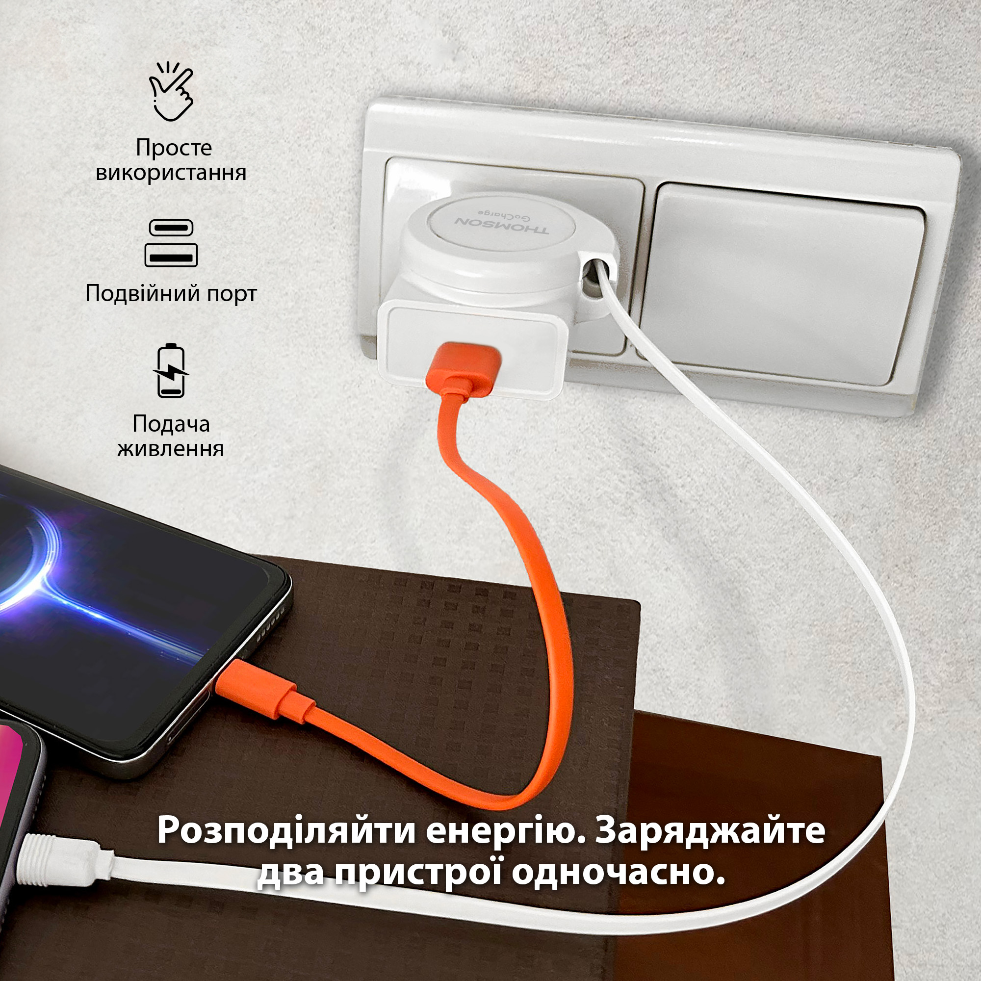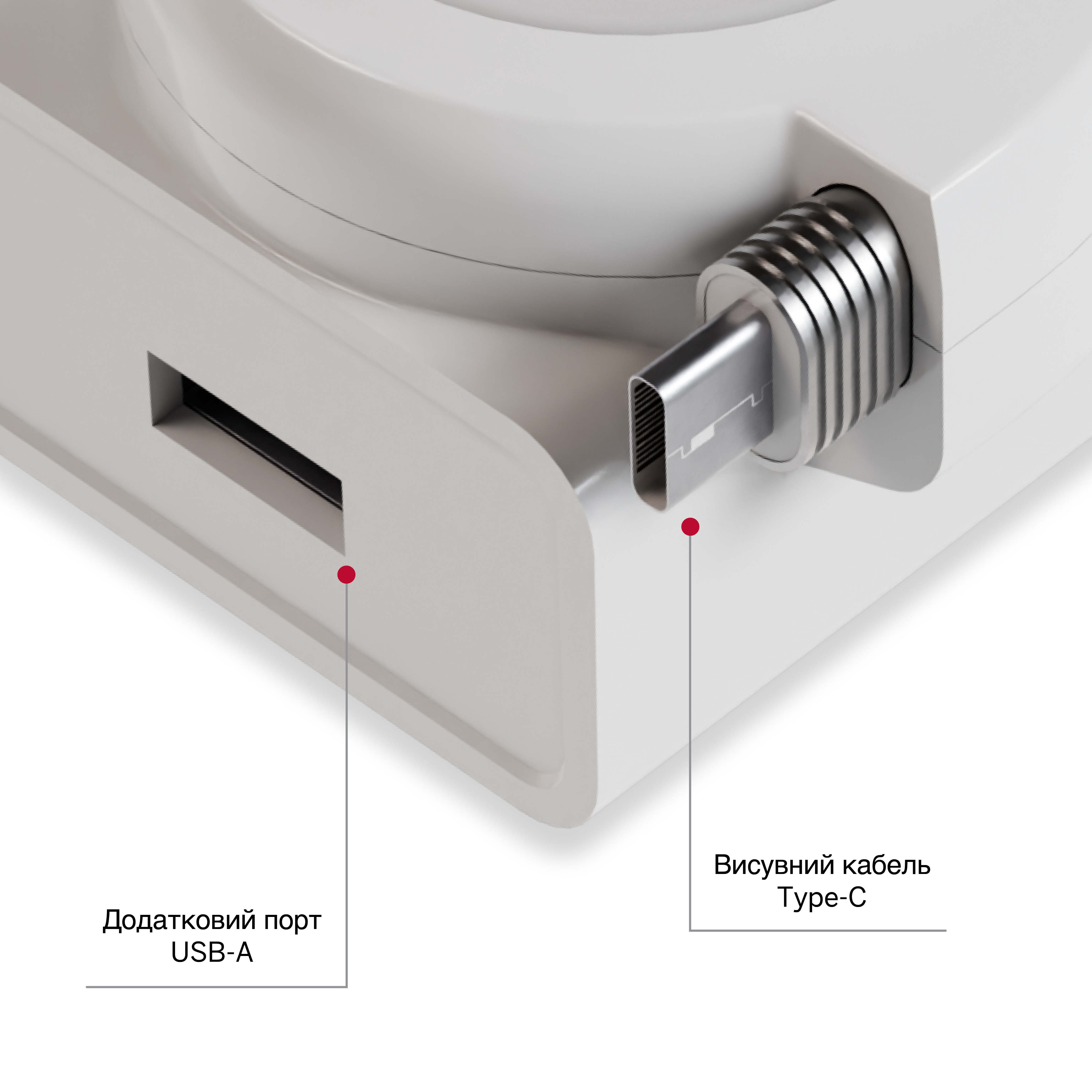 Завдяки вбудованому кабелю USB-C і додатковому порту USB-A ви можете заряджати два пристрої одночасно — ідеально для заряджання смартфона та іншого пристрою, такого як бездротові навушники, ігровий контролер або другий телефон.
