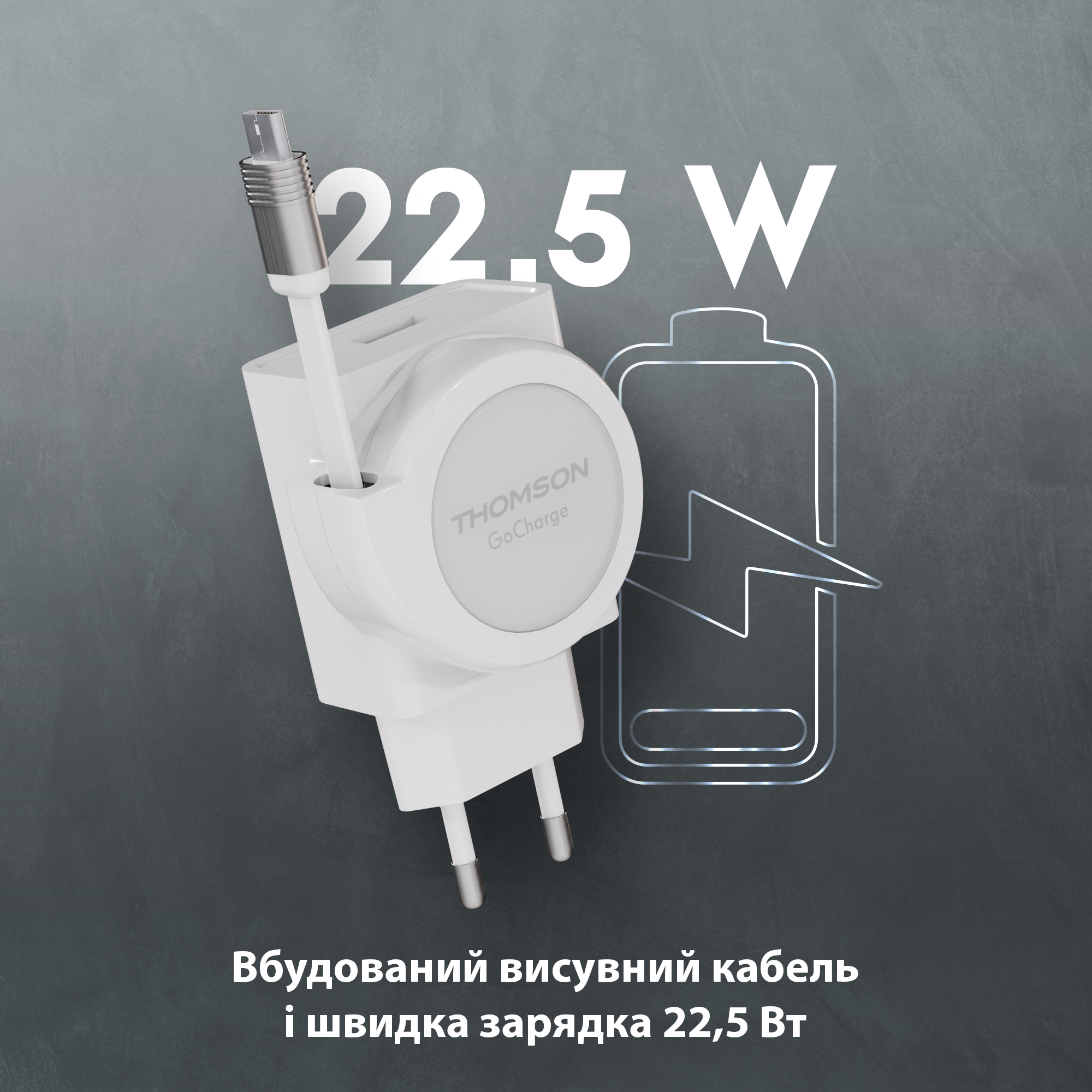 Швидкий, гнучкий і готовий до роботи. Залишайтеся на зв'язку вдома, на роботі або в дорозі з компактним і ефективним зарядним пристроєм Thomson GoCharge E22AC. Розроблений з урахуванням зручності, він оснащений висувним кабелем довжиною 90 см, який регулюється в шести положеннях, що дозволяє уникнути плутанини кабелів і підтримувати порядок.
