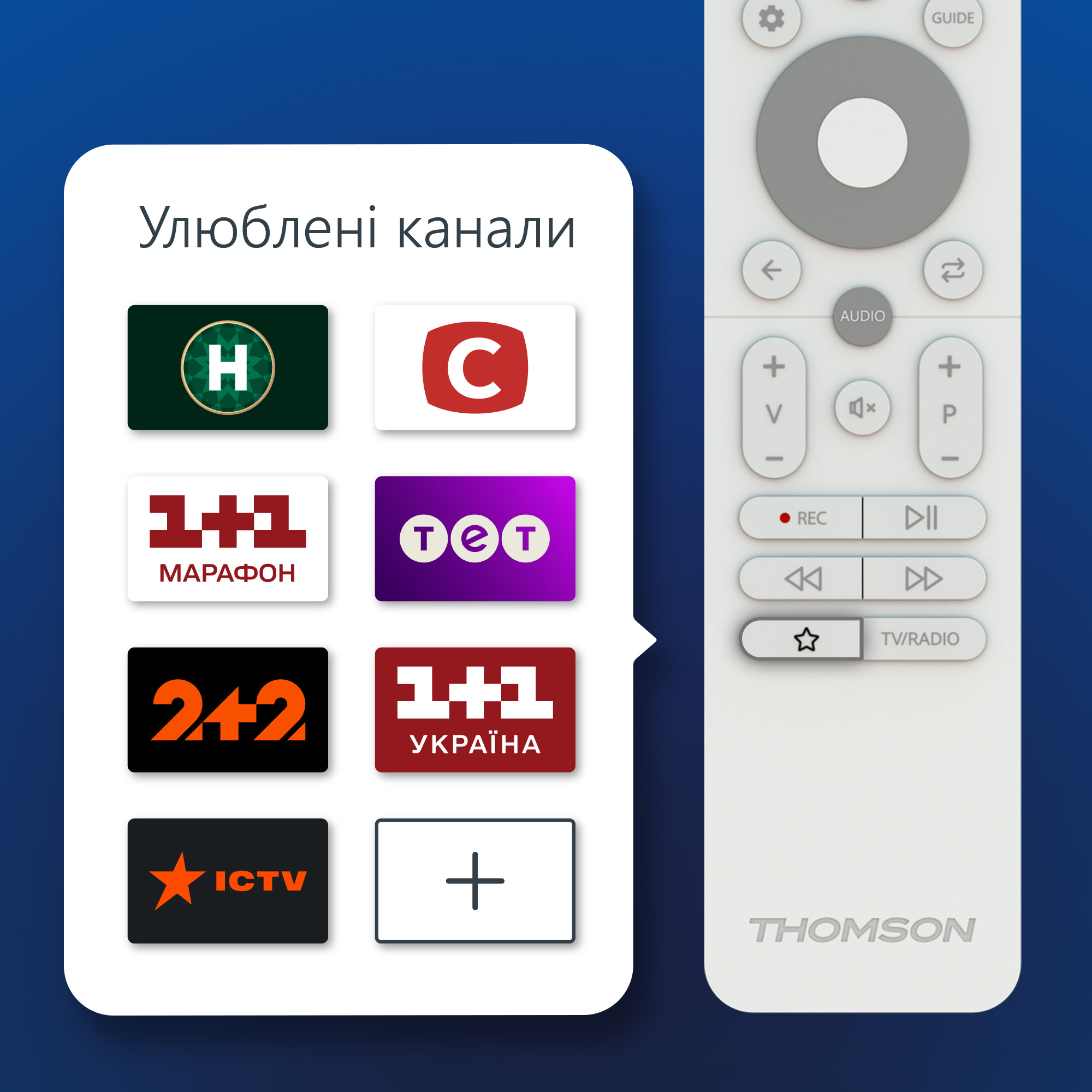 Кнопка Улюблені: Швидкий доступ до улюблених телеканалів одним натисканням кнопки, створюючи власні списки за жанрами, членами сім'ї або іншими вподобаннями.